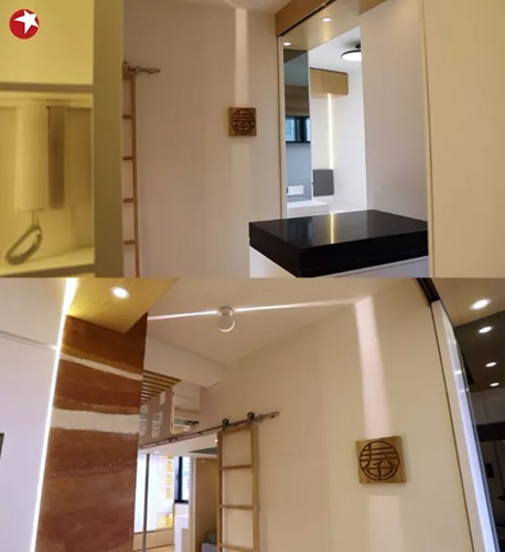 设计师通过采用露开橱、木格栅屋顶、斜坡顶设计,让房间声音得到更好的扩散,使这间小小的唱歌排练厅,在保证最基本的居住需求的同时,还能达到一个较为符合标准的练歌厅需求。
