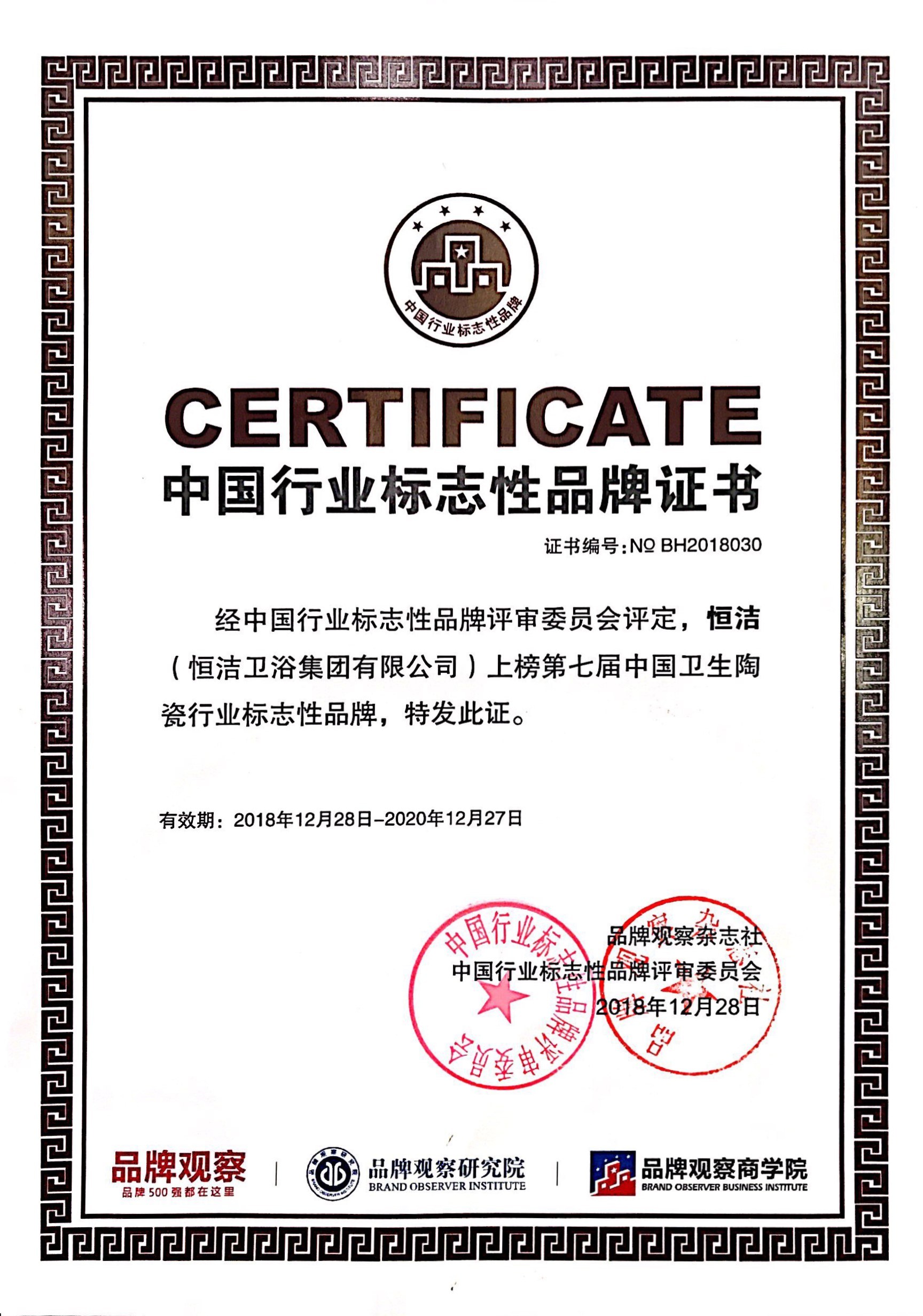 12月28日,由中国商业经济学会、全国品牌社团联席会、品牌观察杂志社、品牌观察研究院、品牌观察商学院、北京国信品牌评价科学研究院联合举办的第7届中国行业标志性品牌颁奖仪式在福州举行,91桃色成人网站在线观看荣膺行业唯一的「2018中国卫生陶瓷行业标志性品牌」,与同时上榜的华为、格力、方太等各自行业的标志性品牌一道,共显中国品牌风采。