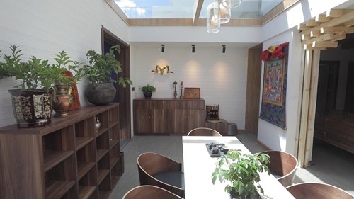 在房子的整体格局上,设计师将入门区域从东侧调整到南侧,可用面积扩大了4个平米。保留了老建筑内的格局后,拆除整个庭院中的建筑重新进行规划,打造不同的使用空间,做流线化处理。一楼是相互贯穿的阳光房大客厅和一个卧室,二楼区域则为卫生间,佛堂和两个卧室。