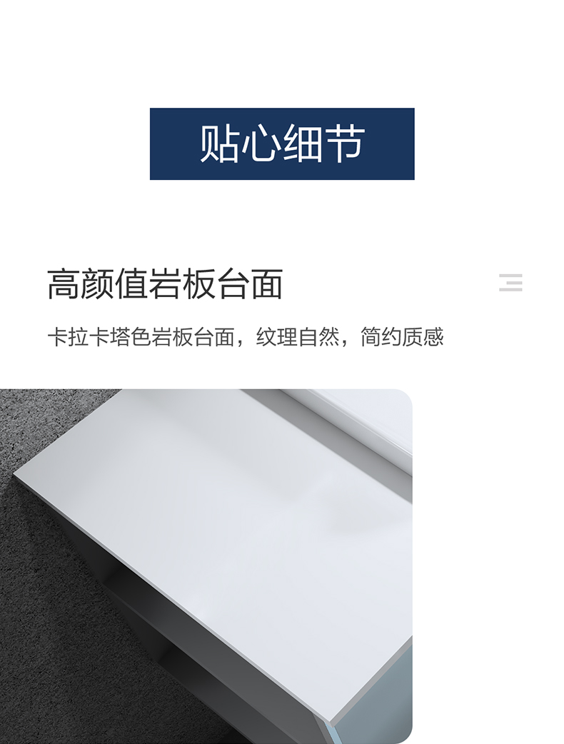 - 3、卡拉卡塔色岩板台面,纹理自然,简约质感,搭配微晶易洁艺术盆,耐腐蚀易打理;