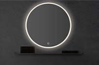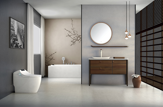 收纳柜上镶着圆形的玫瑰金金属镜框,在这微妙的空间结构中,展现着天圆地方的中式美,这种对禅文化的抽象转译,搭配上LED触感镜灯,意境与科技感并存。