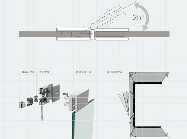 25°角自动闭合玻璃门技术,解决了门铰无法自动闭合所产生的安全银黄。